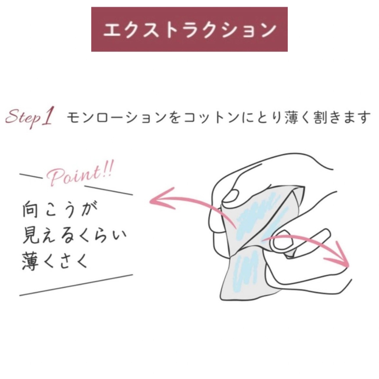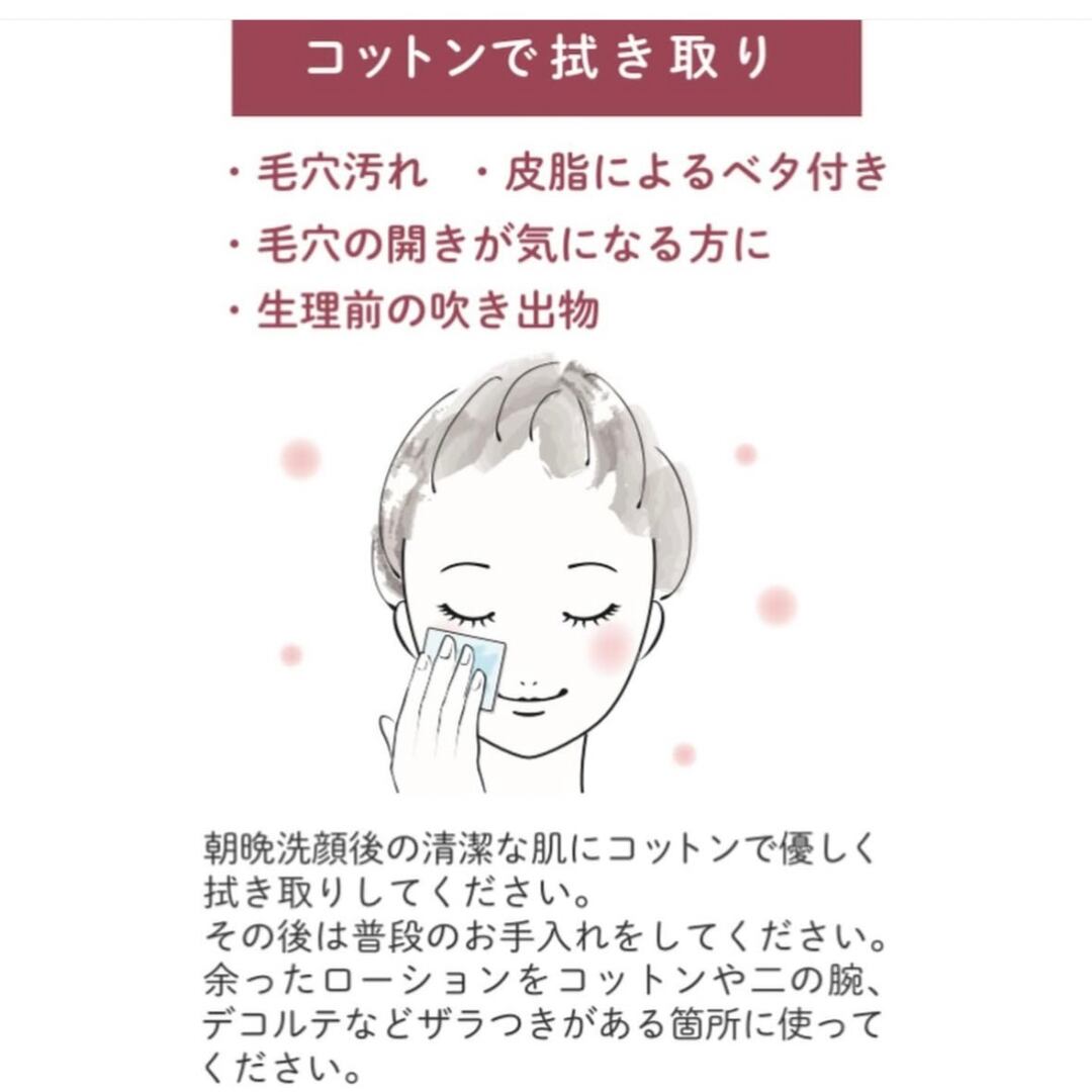 洗顔後の清潔な肌に、コットンに適量を含ませてやさしく拭き取ります。